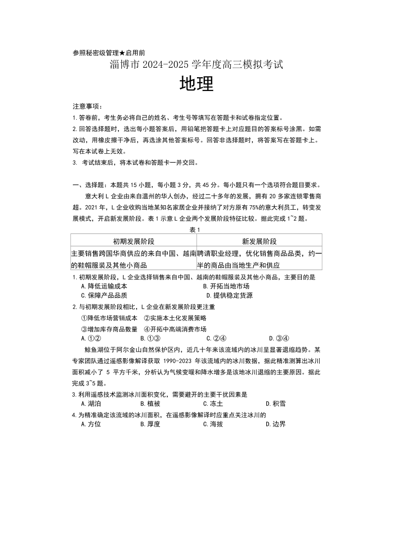 山东省淄博市、滨州市2025届高三模拟考试 地理(含答案).pdf
