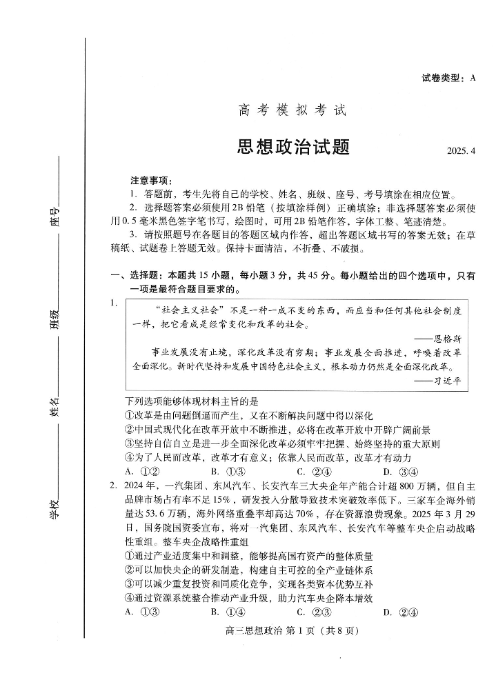 山东省潍坊市2025届高三高考模拟考试 政治.pdf