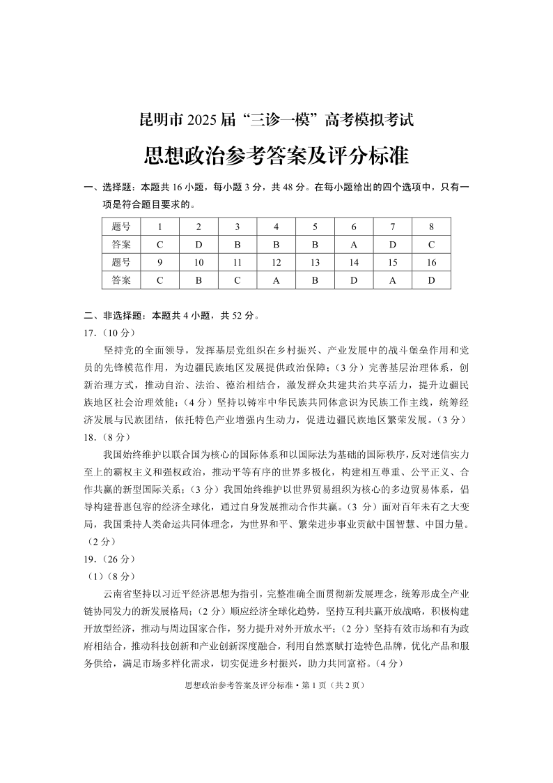 云南省昆明市2025届“三诊一模”高考模拟考试 政治答案.pdf