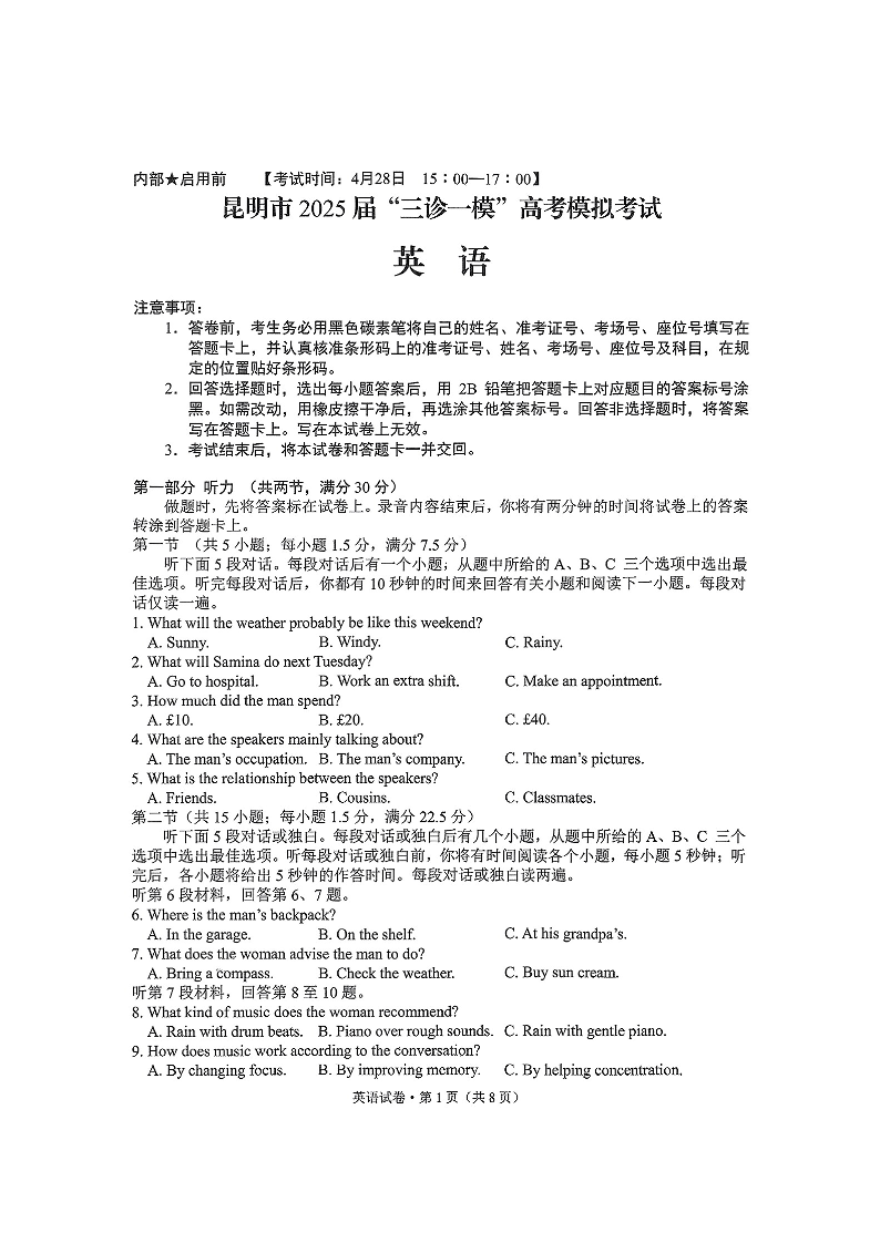 云南省昆明市2025届“三诊一模”高考模拟考试 英语.pdf