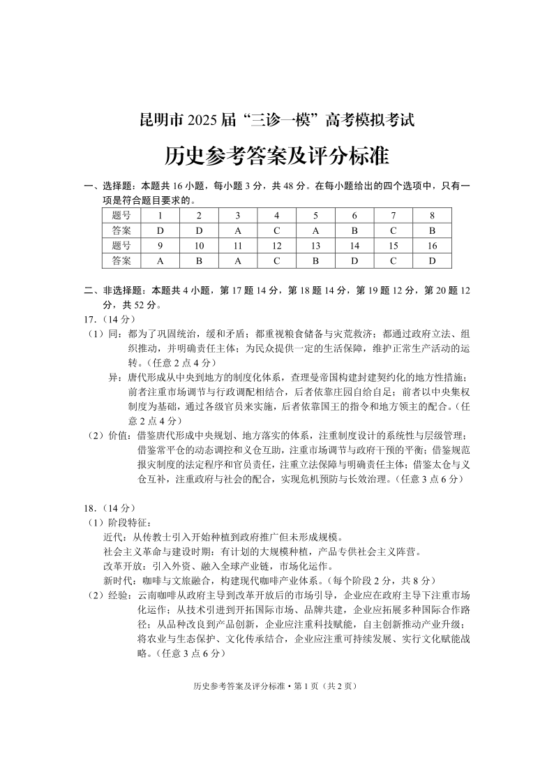 云南省昆明市2025届“三诊一模”高考模拟考试 历史答案.pdf