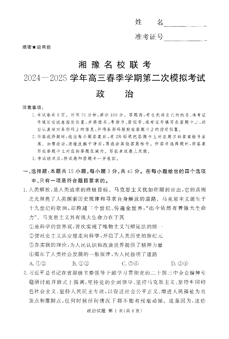 湘豫名校联考2025届高三春季学期第二次模拟考试 政治.pdf