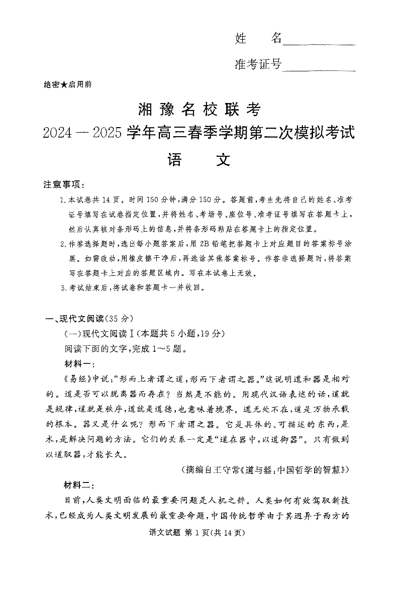 湘豫名校联考2025届高三春季学期第二次模拟考试 语文.pdf