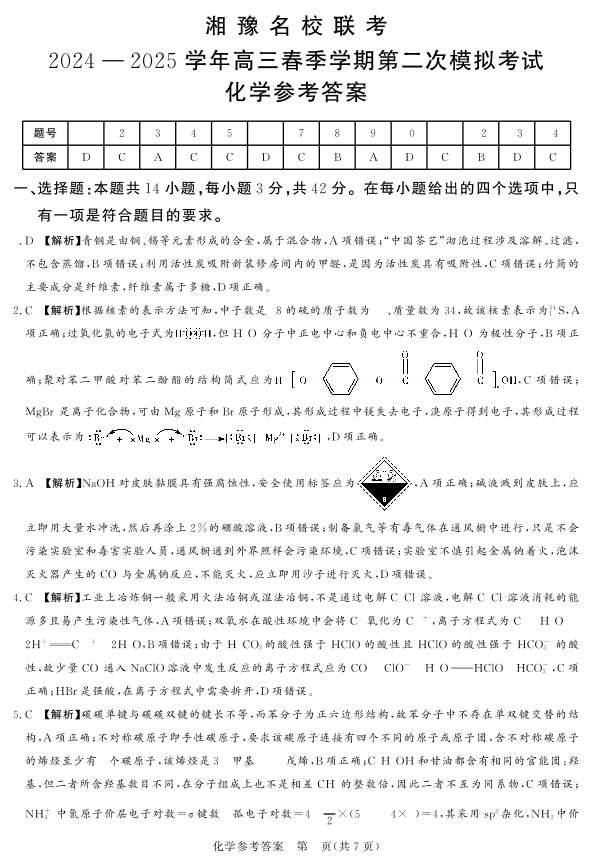 湘豫名校联考2025届高三春季学期第二次模拟考试 化学答案.pdf