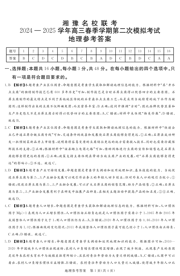 湘豫名校联考2025届高三春季学期第二次模拟考试 地理答案.pdf