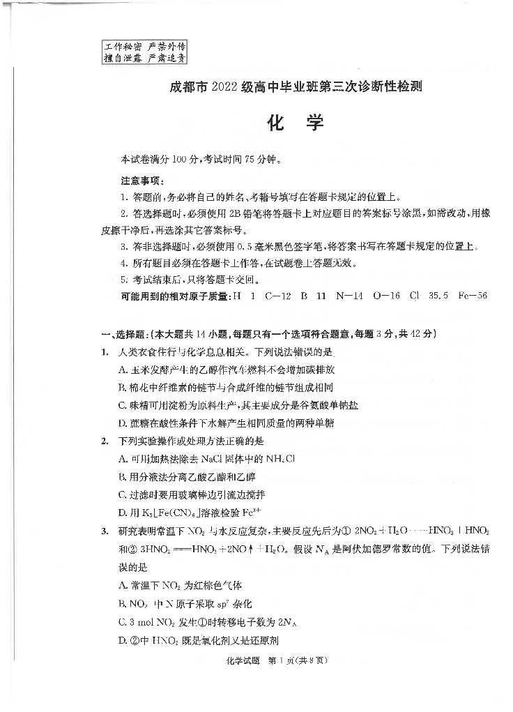 成都市2022级高中毕业班第三次诊断性检测 化学.pdf