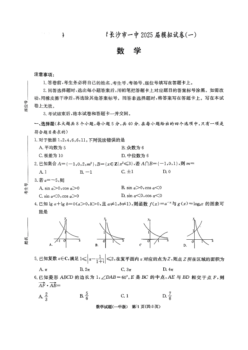 湖南省长沙市第一中学2025届高三下学期模拟(一)数学试题(含答案).pdf