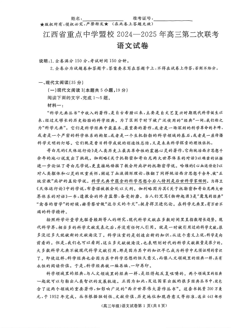 江西省重点中学盟校2024-2025年高三第二次联考 语文(含答案).pdf