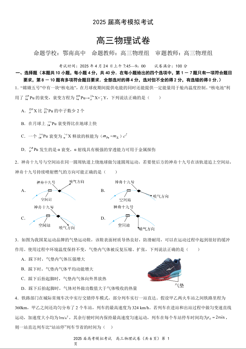 湖北省“黄鄂鄂”2025年高三下学期4月联考 物理.docx