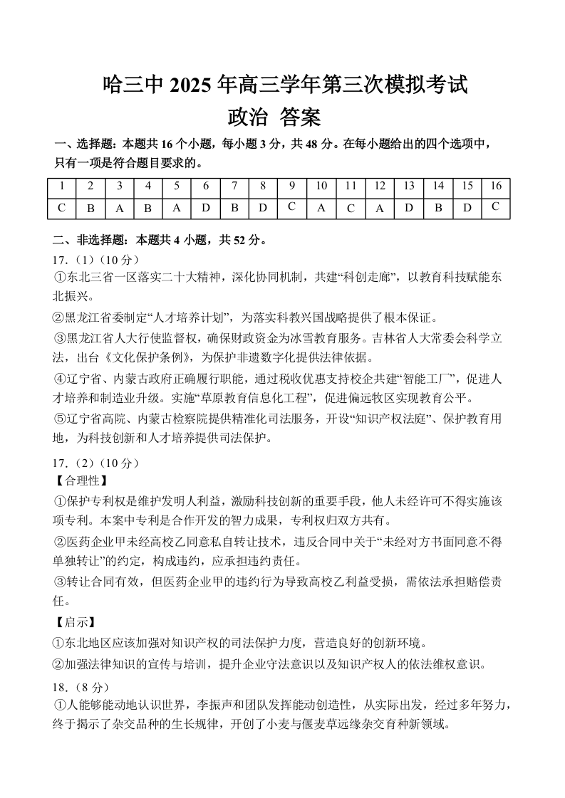 哈尔滨市第三中学2025年高三学年第三次模拟考试 政治答案.docx