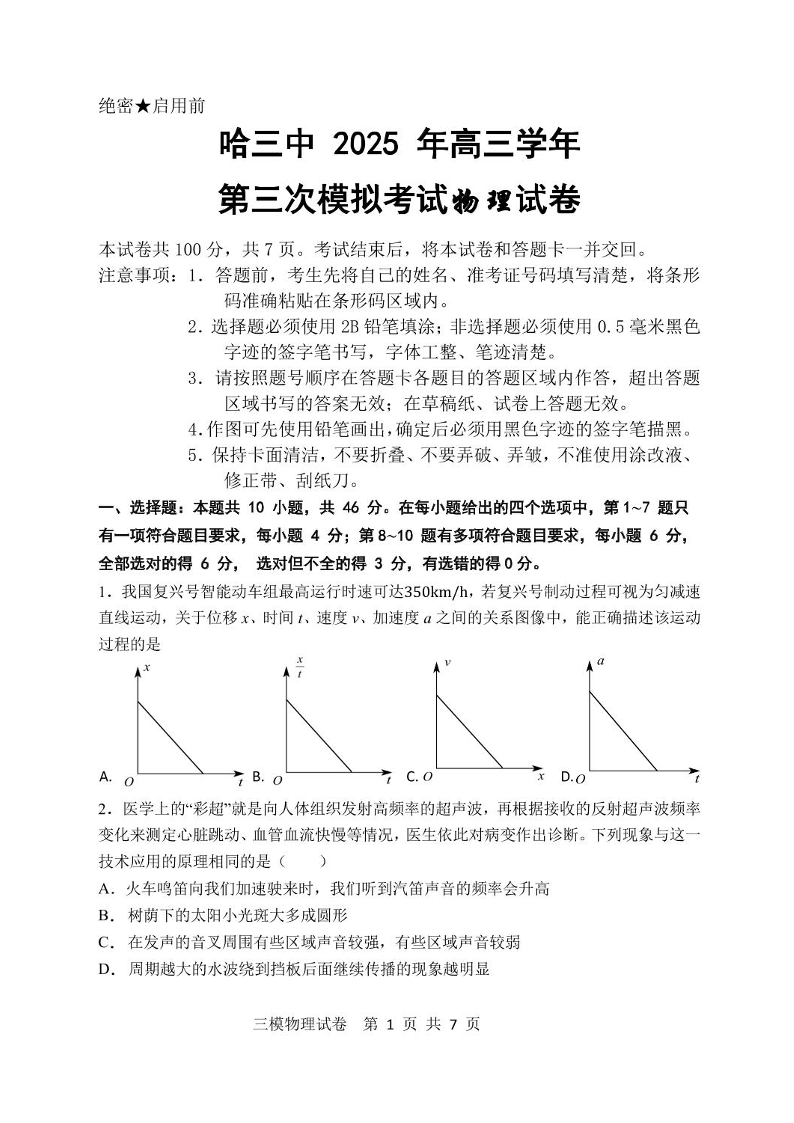 哈尔滨市第三中学2025年高三学年第三次模拟考试 物理(含答案).pdf