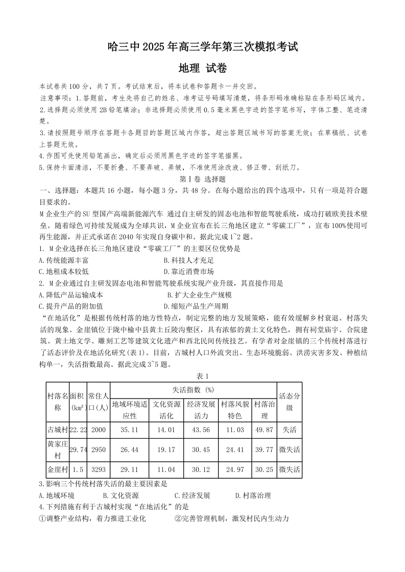 哈尔滨市第三中学2025年高三学年第三次模拟考试 地理.docx