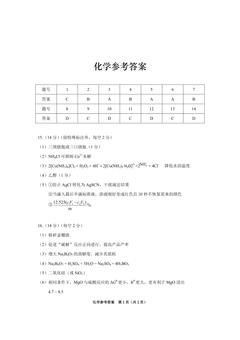 贵州省2025年基础教育质量提升普通高中教学检测 化学答案.pdf