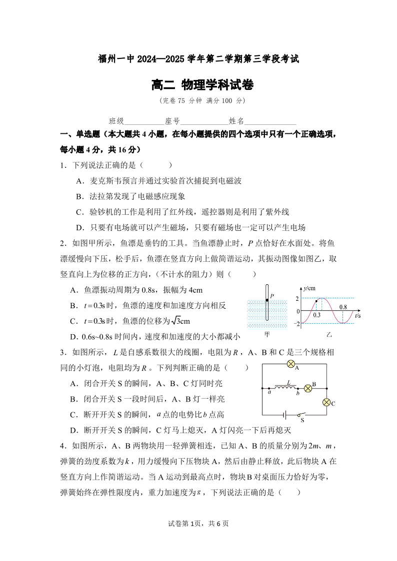 福州市第一中学2024-2025学年高二下学期期中测试 物理(含答案).pdf