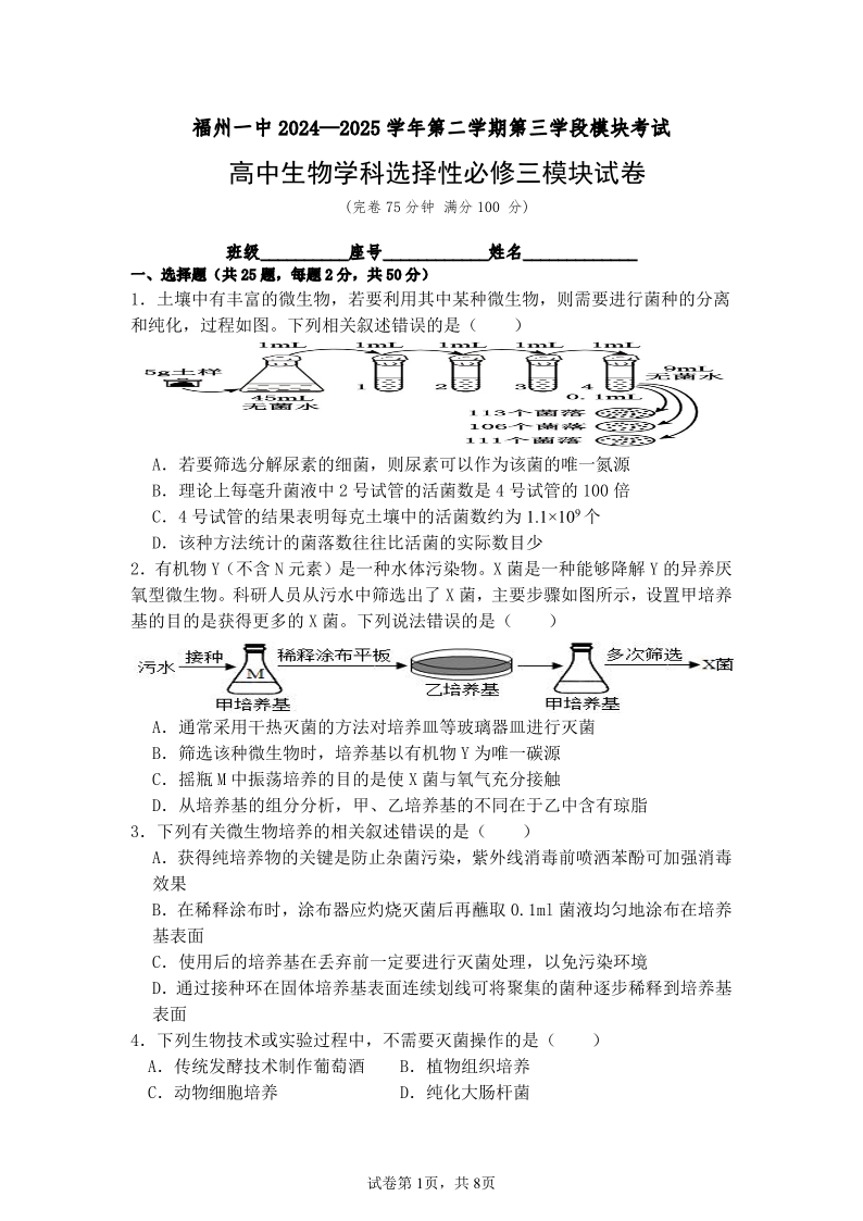 福州市第一中学2024-2025学年高二下学期期中测试 生物(含答案).pdf