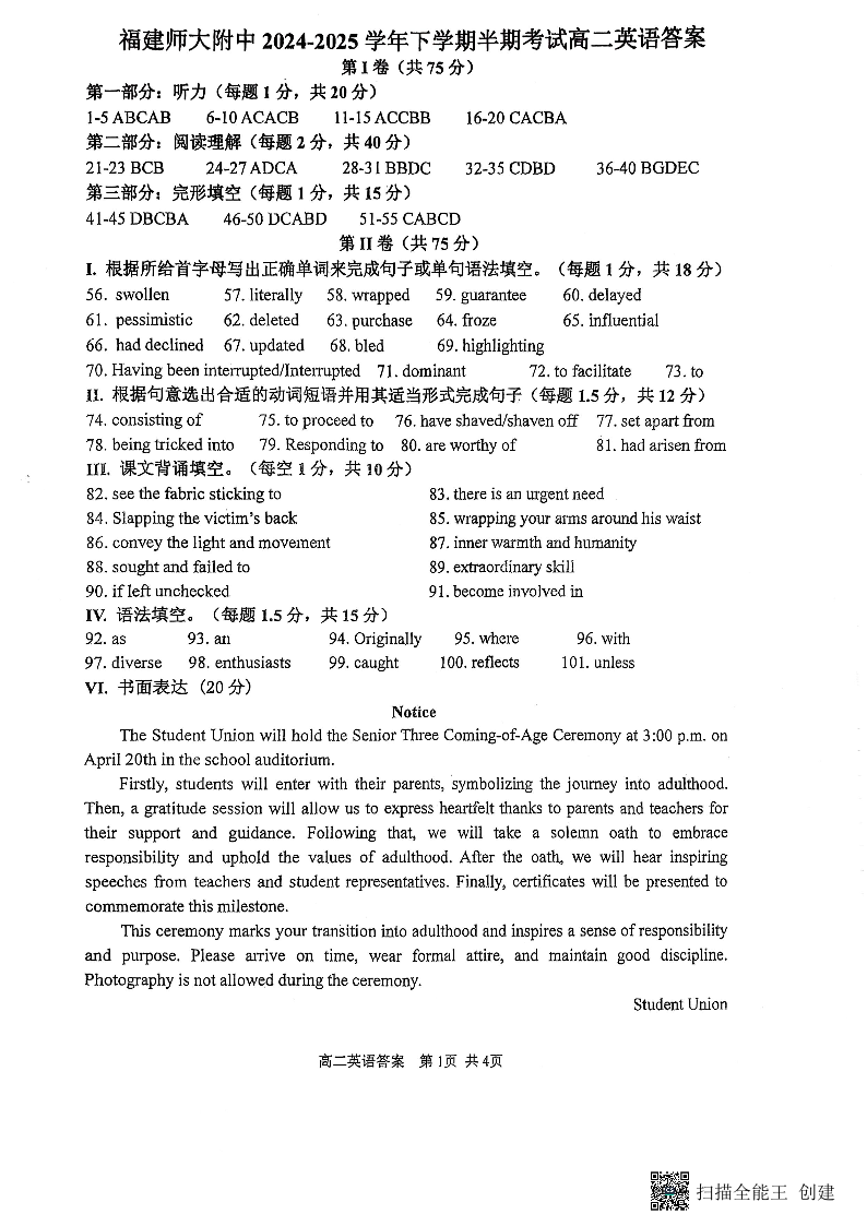 福建师大附中2024-2025学年下学期期中考试 高二英语答案.pdf