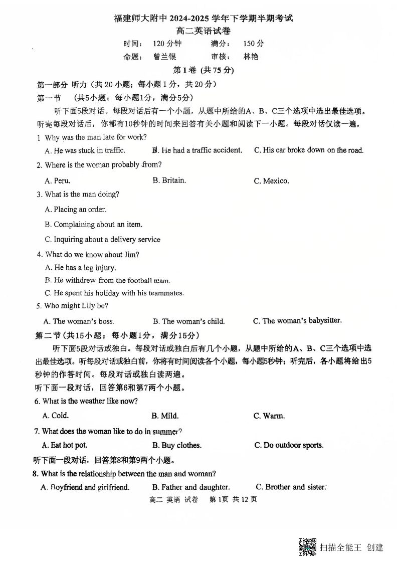 福建师大附中2024-2025学年下学期期中考试 高二英语.pdf