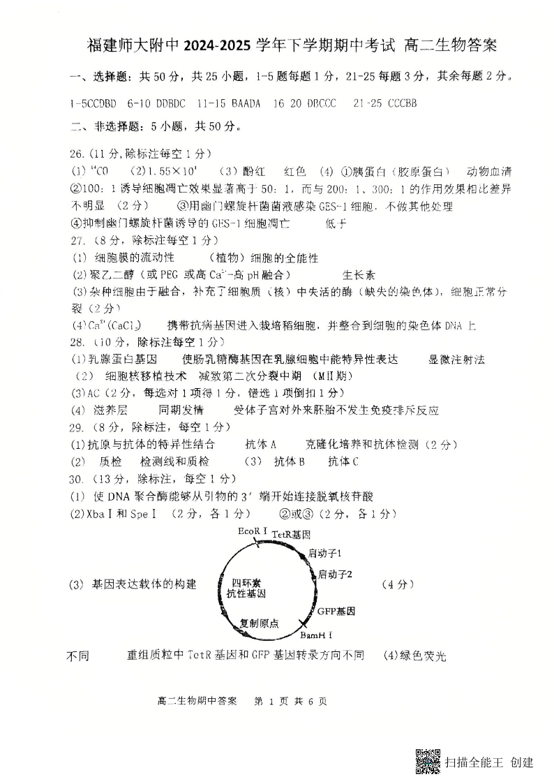 福建师大附中2024-2025学年下学期期中考试 高二生物答案.pdf