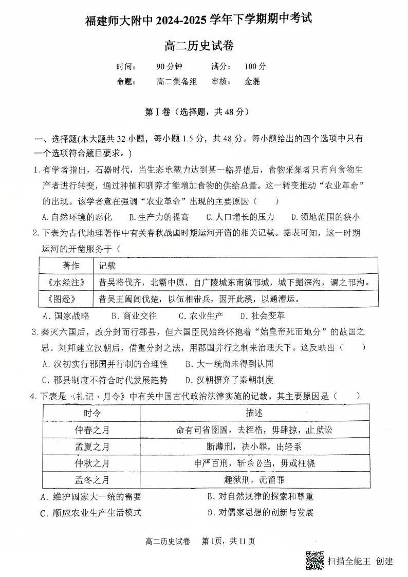 福建师大附中2024-2025学年下学期期中考试 高二历史.pdf