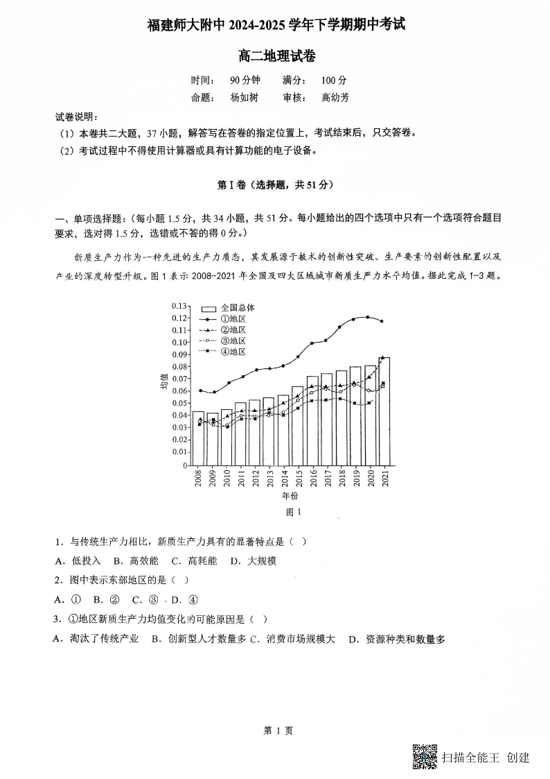 福建师大附中2024-2025学年下学期期中考试 高二地理.pdf