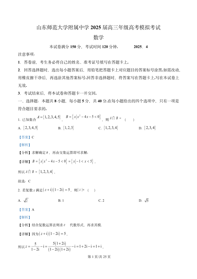 山东师范大学附属中学2025届高三年级高考模拟考试 数学答案.pdf
