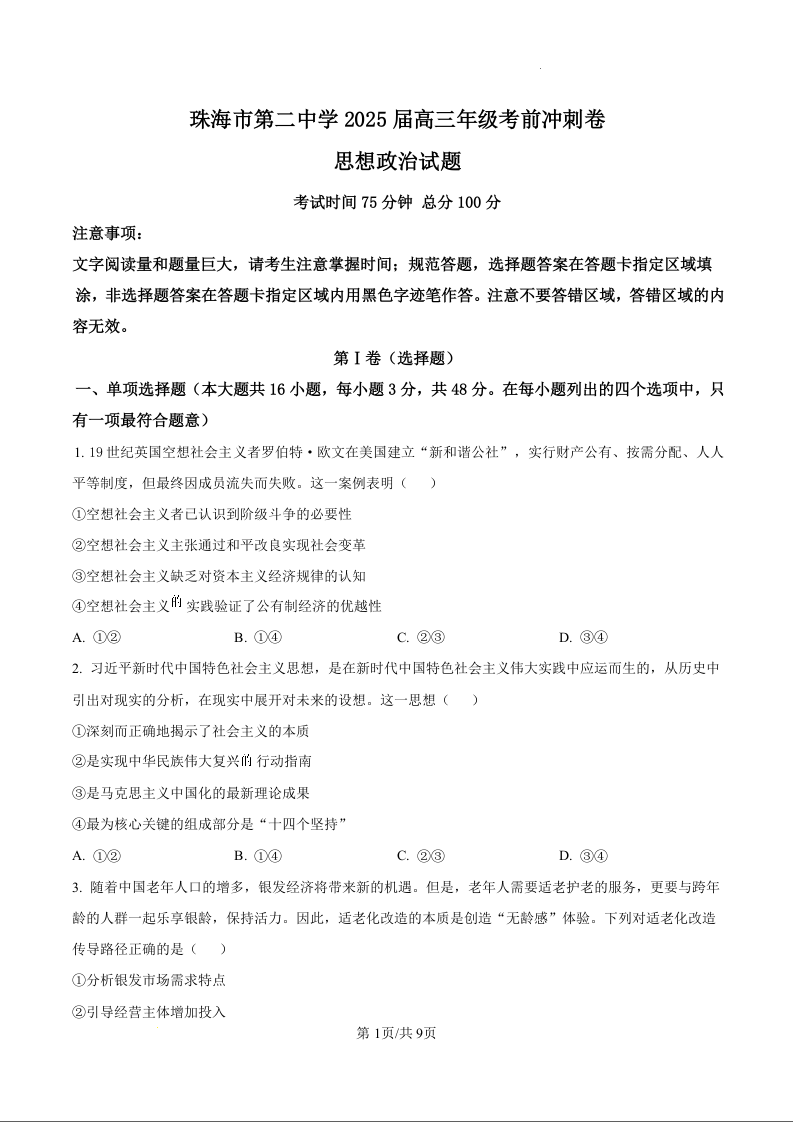 珠海市第二中学2025届高三年级考前冲刺卷 政治.docx