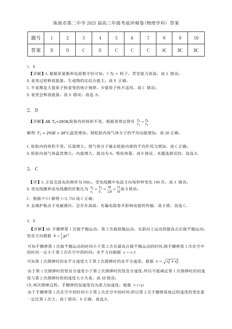 珠海市第二中学2025届高三年级考前冲刺卷 物理答案.docx