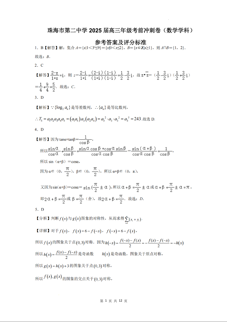 珠海市第二中学2025届高三年级考前冲刺卷 数学答案.docx