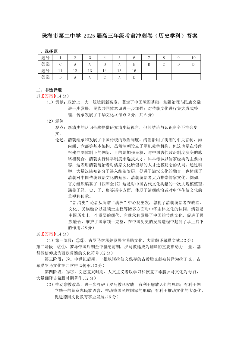 珠海市第二中学2025届高三年级考前冲刺卷 历史答案.docx