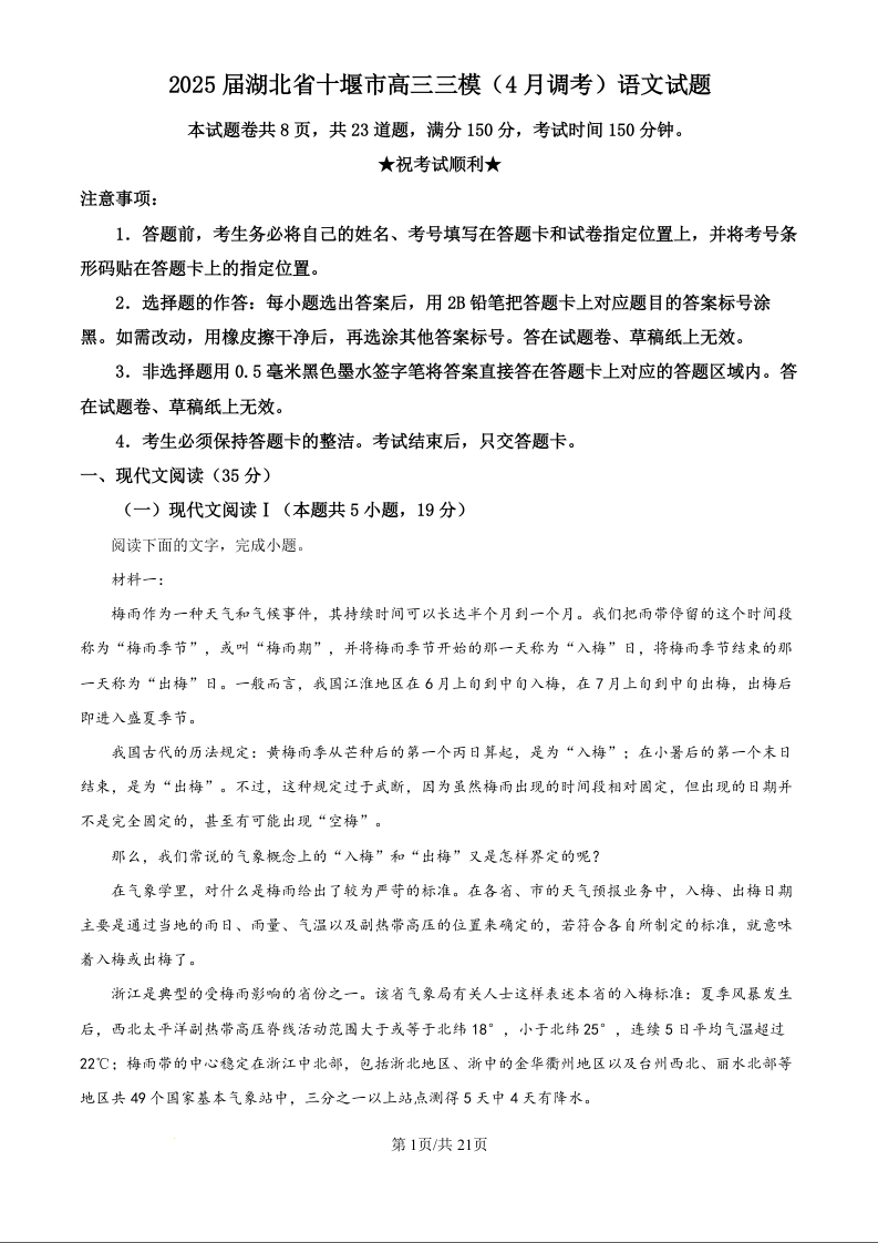 十堰市2025年高三年级四月调研考试 语文答案.docx