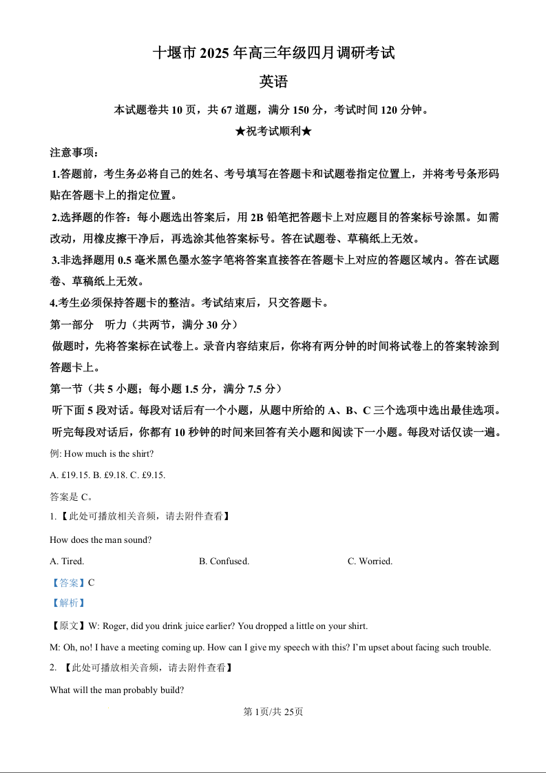 十堰市2025年高三年级四月调研考试 英语答案.docx