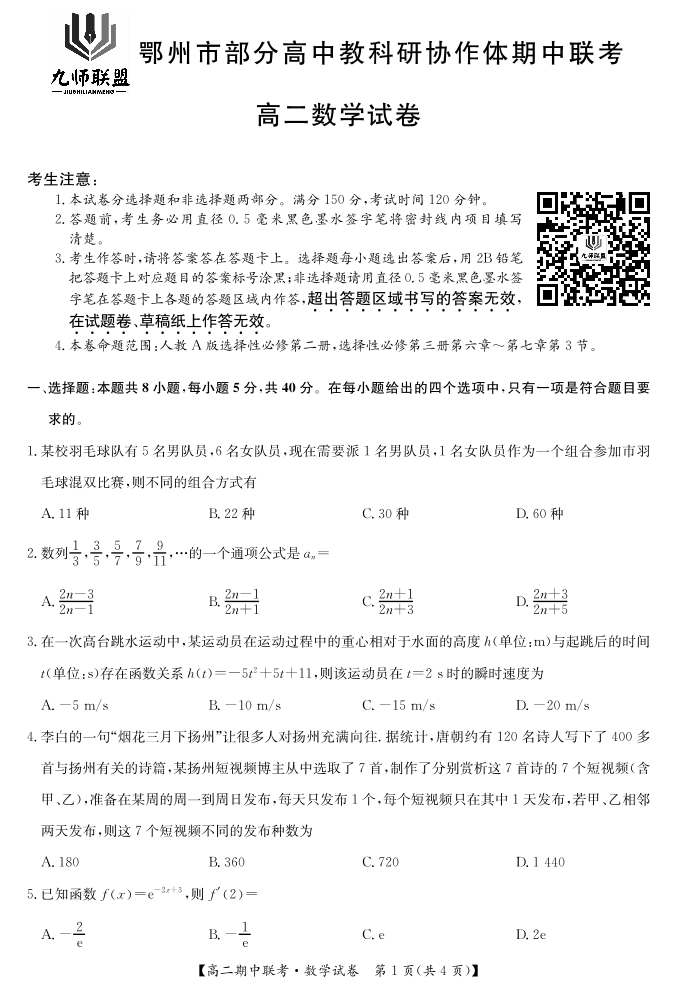 数学-鄂州市高二期中联考.pdf