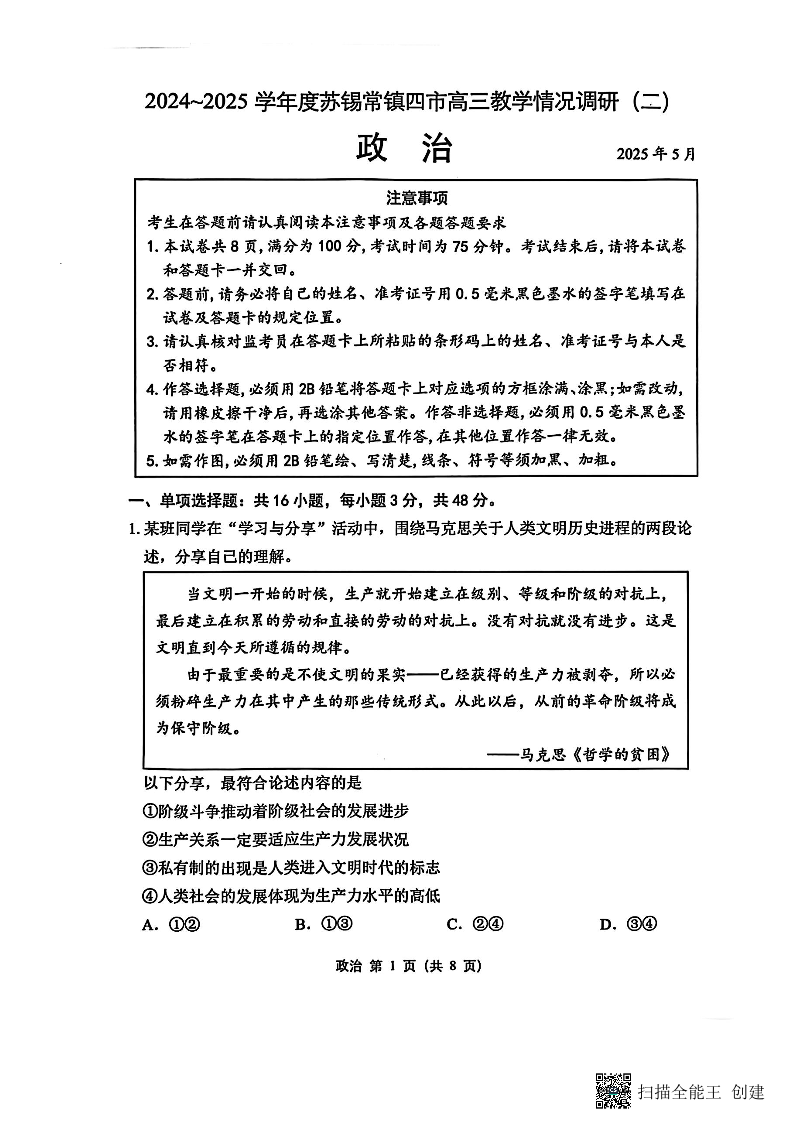 2024-2025学年度苏锡常镇四市高三教学情况调研(二)政治(含答案).pdf