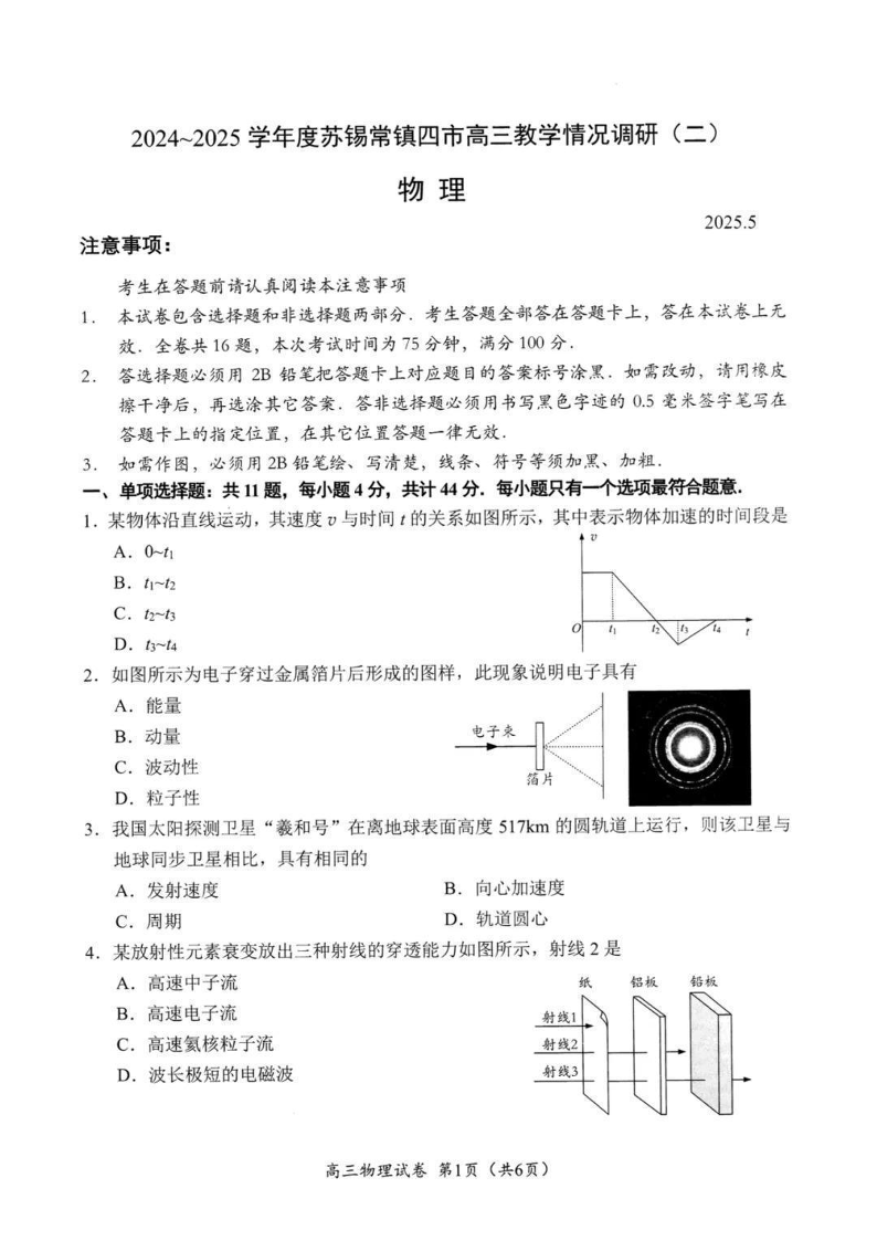2024-2025学年度苏锡常镇四市高三教学情况调研(二)物理(含答案).pdf