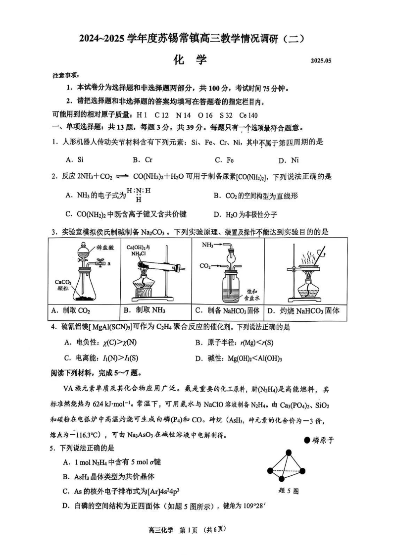 2024-2025学年度苏锡常镇四市高三教学情况调研(二)化学(含答案).pdf