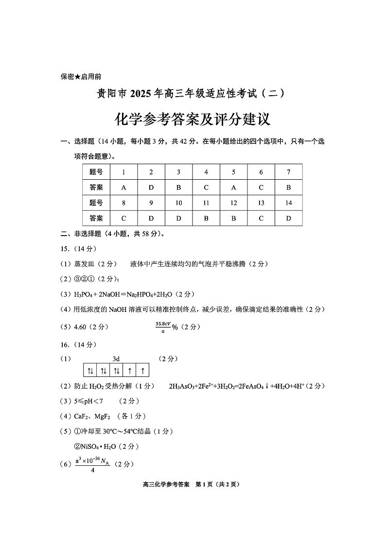 贵阳市2025年高三年级适应性考试(二)化学答案.pdf