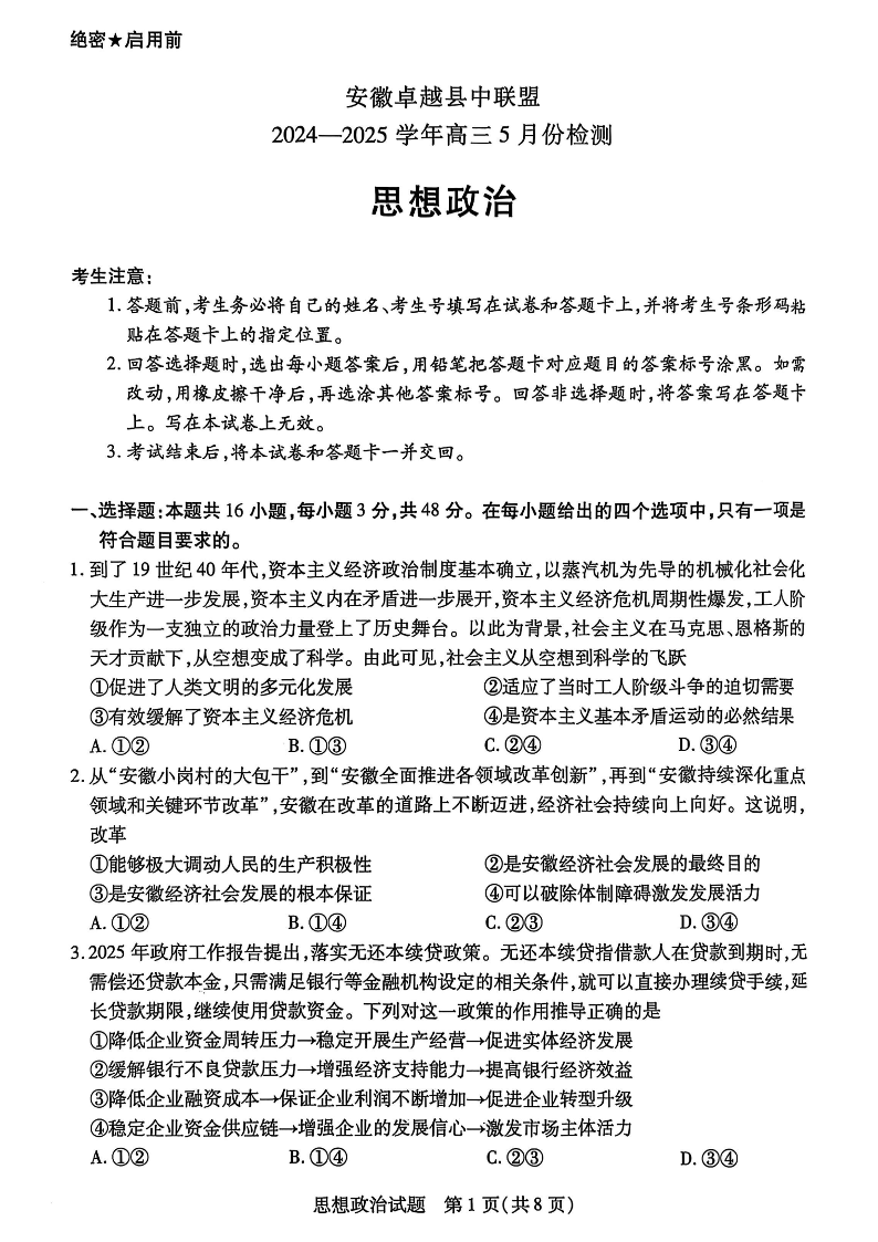 安徽卓越县中联盟2024—2025学年高三下学期5月份检测 政治(含答案).pdf