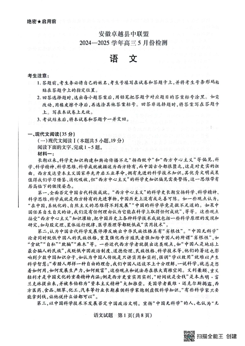 安徽卓越县中联盟2024—2025学年高三下学期5月份检测 语文(含答案).pdf