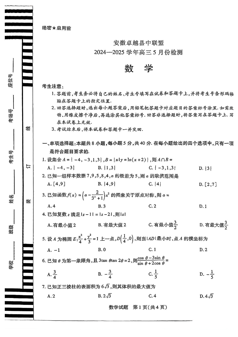 安徽卓越县中联盟2024—2025学年高三下学期5月份检测 数学(含答案).pdf