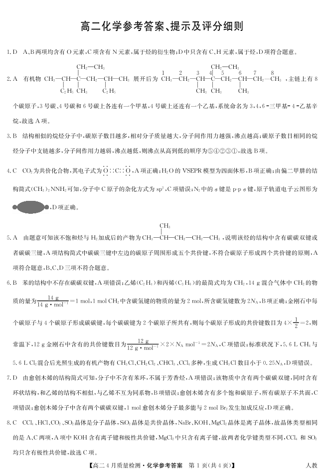 化学答案-高二4月质量检测(人教).pdf