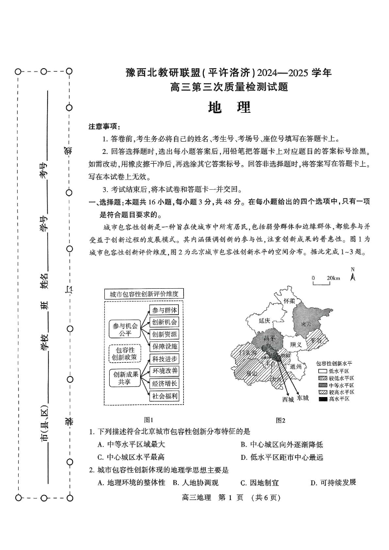 河南省豫西北教研联盟(许平洛济)2025届高三下学期第三次质量检测地理试卷+答案.pdf