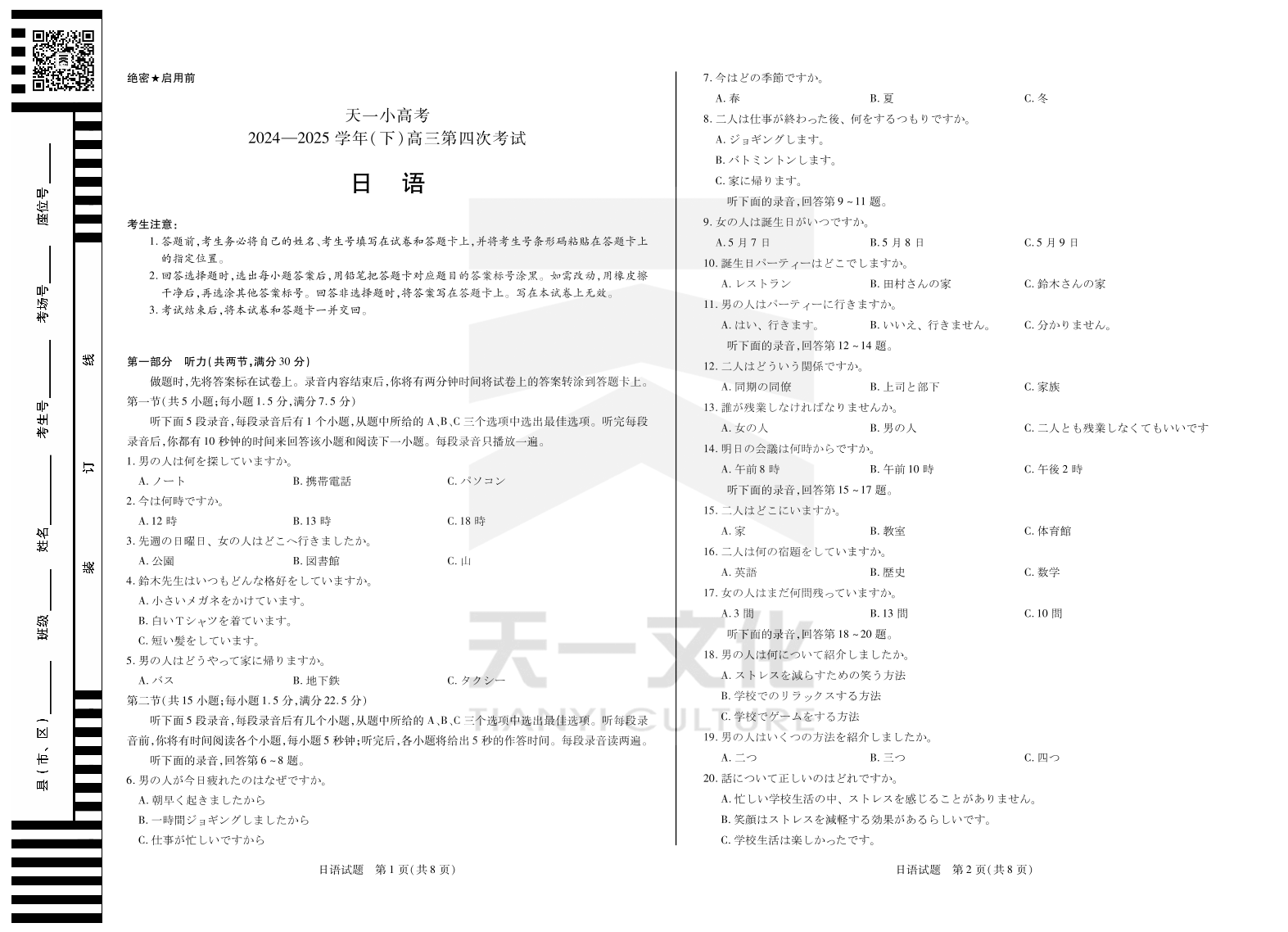 【日语】天一大联考·河南省天一小高考2024-2025学年(下)高三第四次考试.pdf