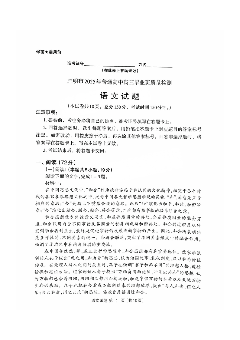 福建省三明市2025年普通高中高三毕业班质量检测语文.pdf