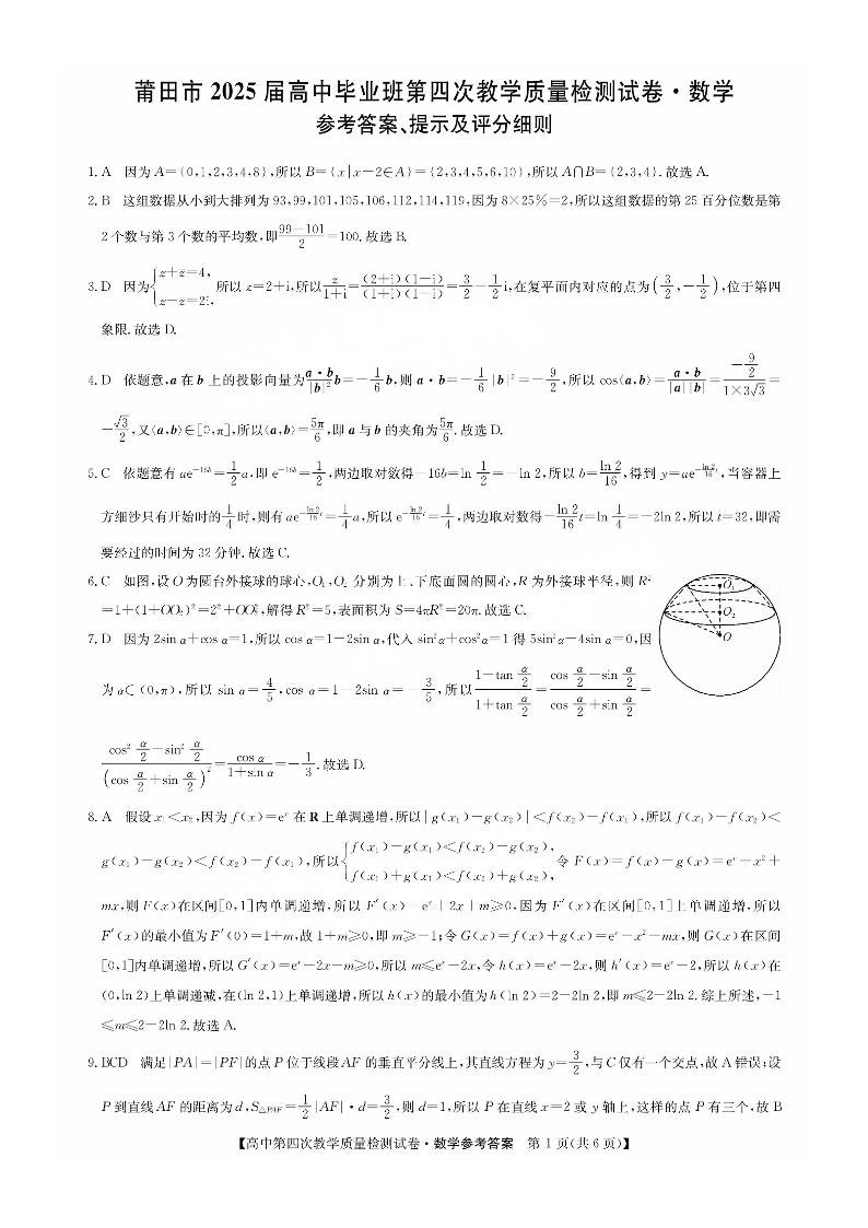 福建省莆田市2025届高中毕业班第四次教学质量检测数学答案.pdf