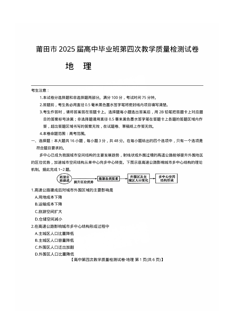 福建省莆田市2025届高中毕业班第四次教学质量检测地理.pdf