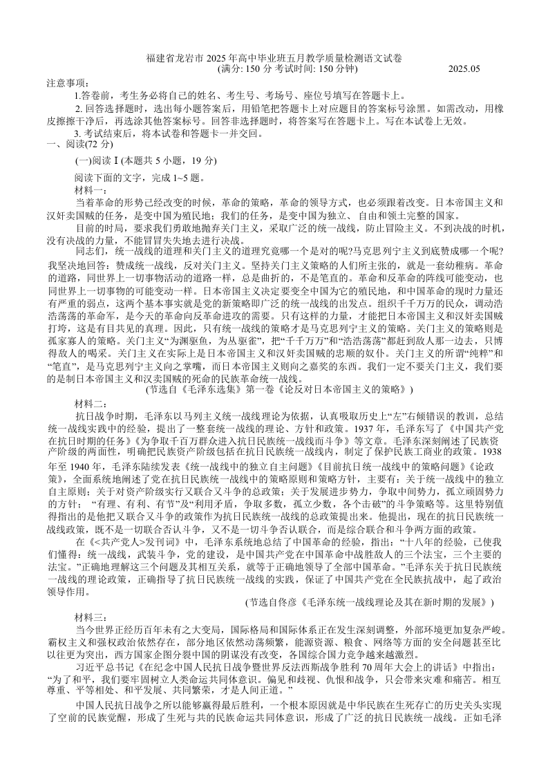 福建省龙岩市2025年高中毕业班五月教学质量检测语文(含答案).docx