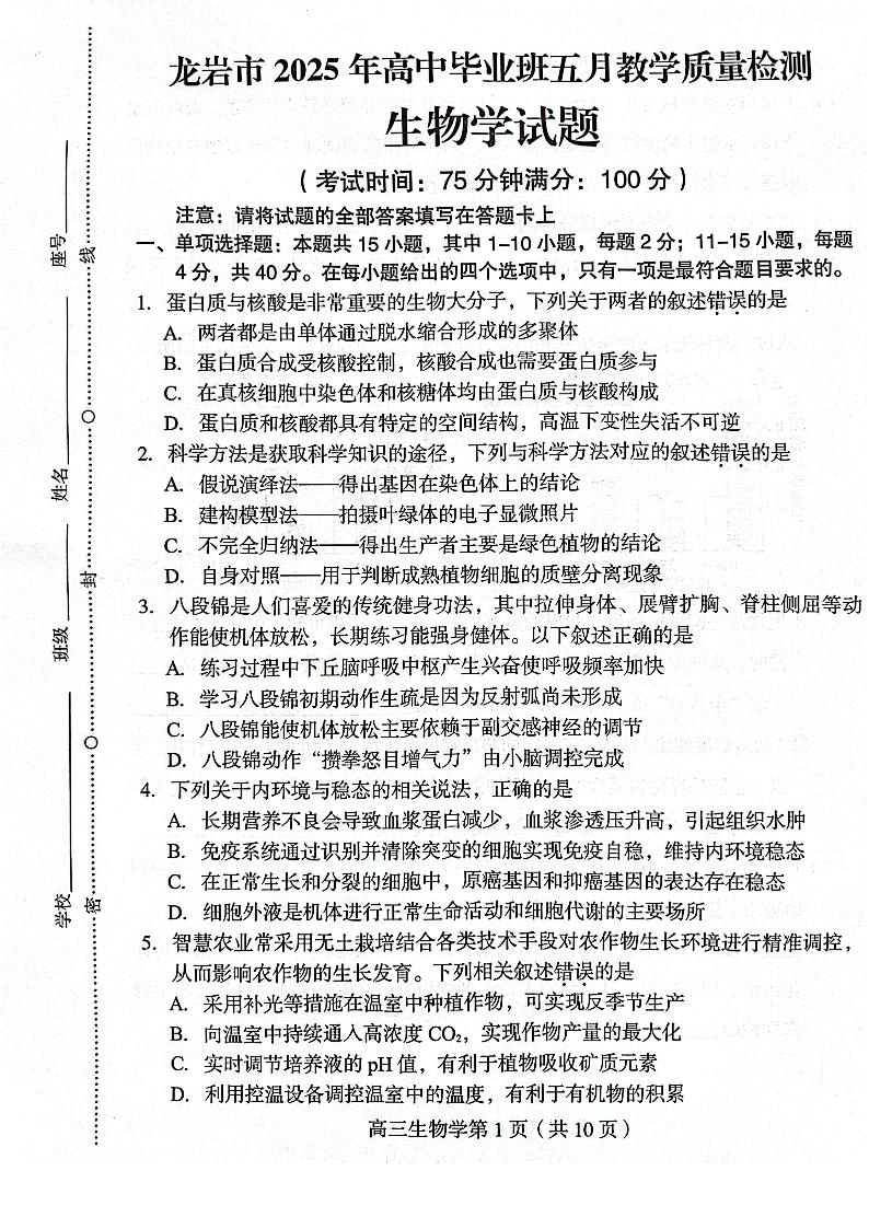 福建省龙岩市2025年高中毕业班五月教学质量检测生物.pdf
