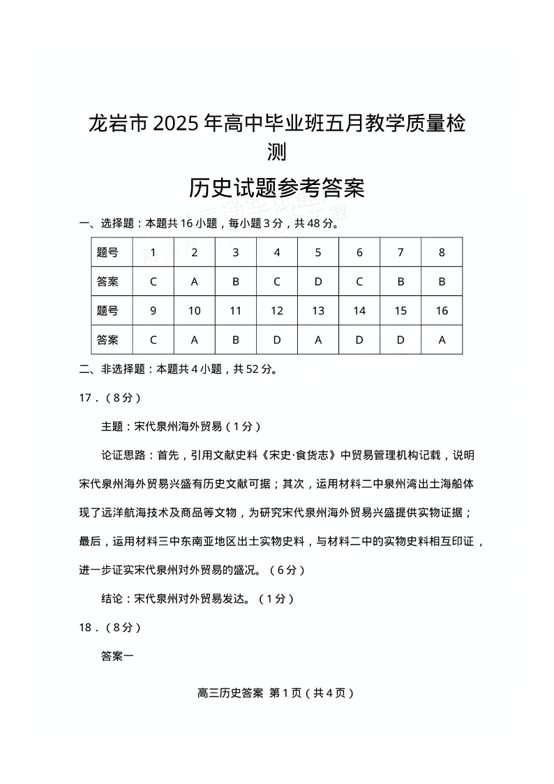福建省龙岩市2025年高中毕业班五月教学质量检测历史答案.pdf