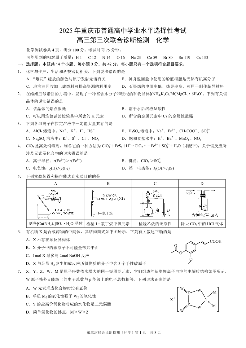 重庆市2025年高三第三次联合诊断检测 化学(康德卷).pdf