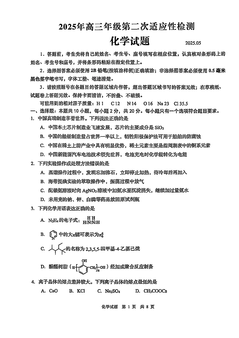 山东省青岛市 淄博市2025年高三年级第二次适应性检测 化学.pdf